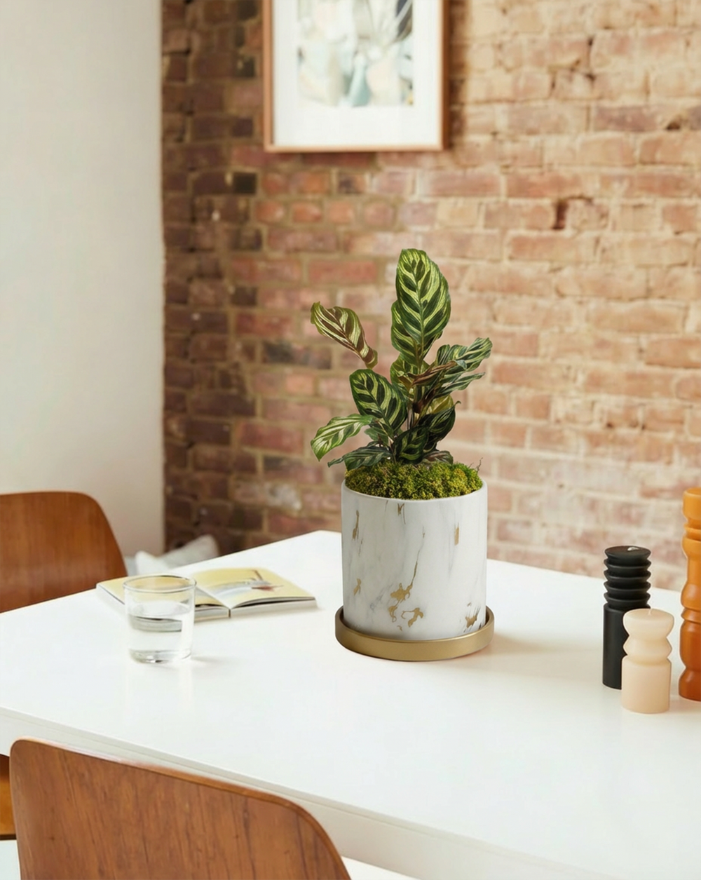 Thrives in medium to bright, indirect light. Think of it like a vampire—it hates direct sun! Harsh rays will fade the beautiful pattern and burn the delicate leaves.