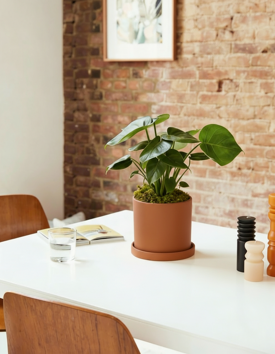 Needs bright, indirect light to develop those famous splits (fenestrations). It can live in lower light, but the leaves will stay smaller and solid heart-shaped. Avoid harsh midday sun which can scorch the leaves.